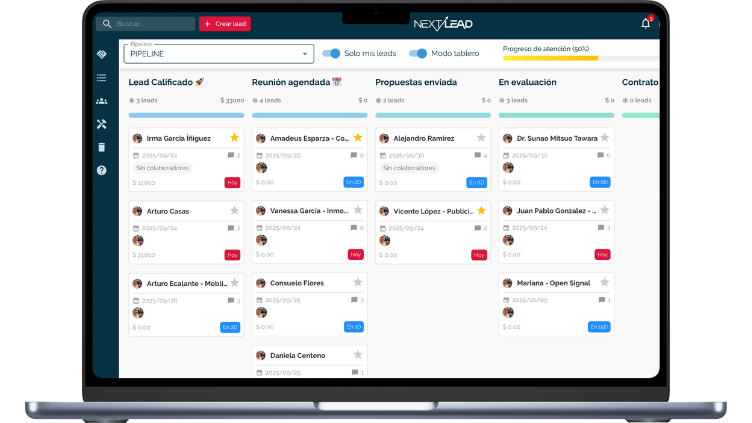 NextLead cuenta con un Pipeline visual que te ayudará a no perder de vista ningún lead y no olvidar ningún seguimiento.